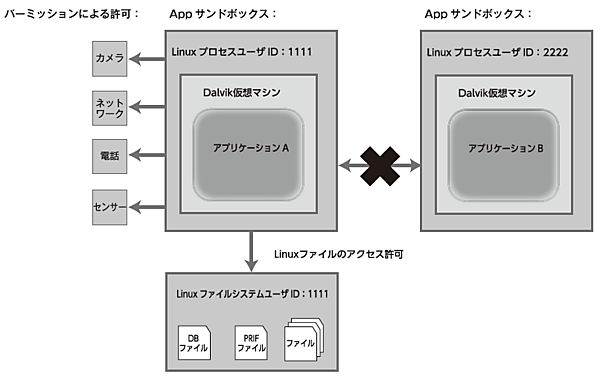 アンドロイドOSにインストールされたアプリケーションにはそれぞれ個別のIDが割り当てられます。このIDはLinuxのユーザIDとグループIDに相当します。また、アンドロイドOS自体もいくつかのIDによって分割されています。 - パーミッション