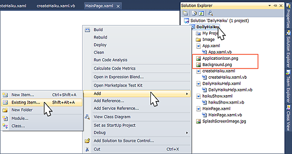 Visual Studioでプロジェクトを開き、プロジェクト名を右クリックして、「追加/既存アイテムの追加」を選択します(図2)。デフォルトのApplicationIcon.png とBackground.pngを、追加した画像に置き換えます。