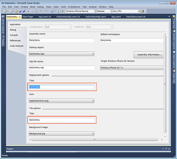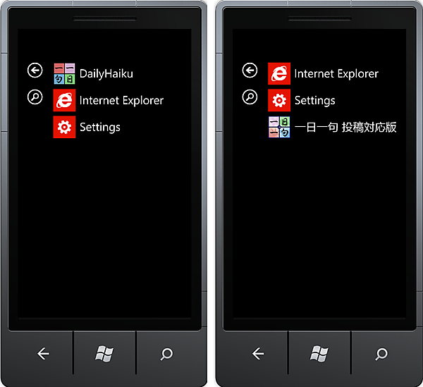 Windows Phone 実機に表示されるアプリのタイトルは、デフォルトでは英字表記です。図3の左側はデフォルト、右側は日本語タイトルに変更した例です。これはエミュレーターの画面ですが、実機でも同じです(図3)。