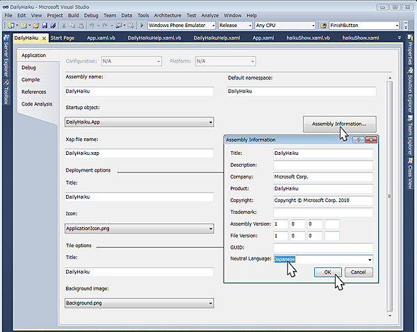 例えば英語版の開発環境で開発したアプリを、日本国内のみで公開したい場合は、言語をJapaneseに変更します(図6)。「プロジェクト(P)/(プロジェクト名)のプロパティ(P)」をクリックして表示されるウィンドウで、「アセンブリ情報」をクリックし、「ニュートラル言語(N)」を変更します。