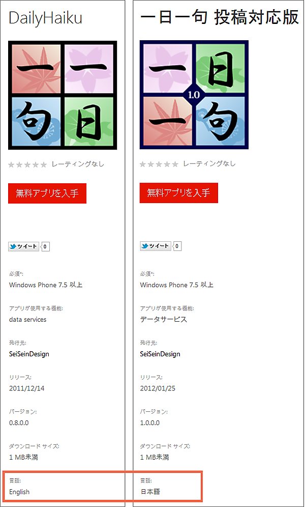 図7左の俳句アプリ「一日一句」は、英語版環境で開発し、デフォルトのままで公開し、「言語」は「English」になっています。一方、図7右の「一日一句投稿対応版」は、同じく英語版で開発していますが、プロパティを変更して申請したため 「言語」は「日本語」になっています(図7)。