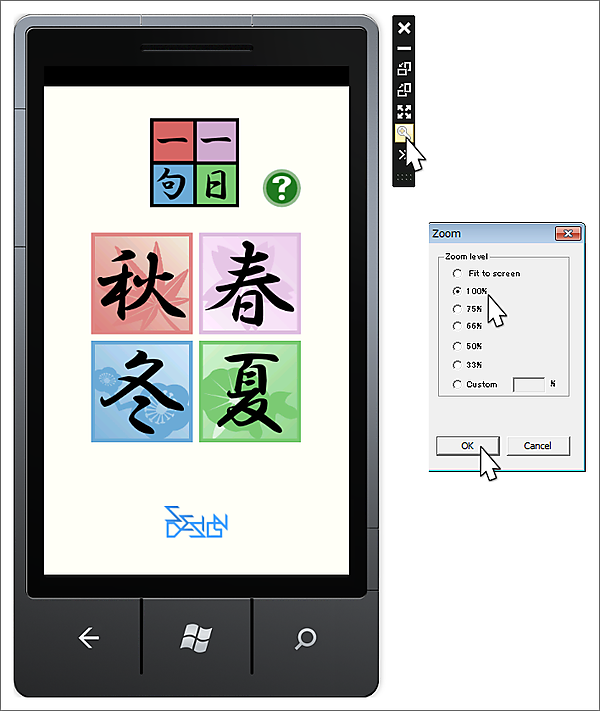 スクリーンショットを撮るには、プロジェクトを開き、「Windows PhoneEmulator(JA)」「Debug」を指定したうえで、「デバッグ(D)/デバッグ開始(S)」します。480×800pixelという規定に沿うよう、エミュレーターの右側に表示されるツールボックスから虫眼鏡を選択して、ズームレベルを100%に設定しておきます(図9)。