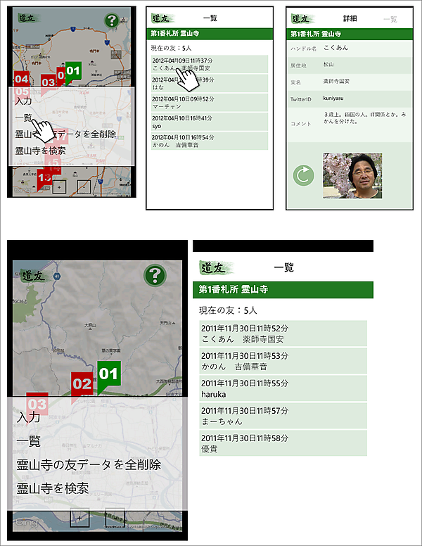 例えば、筆者たちのコラボレーションによるアプリ「道友」(四国八十八か所での出会いを記録するもの)では、図13上図のように、ショットのズームレベルを調整して撮り、各ショット間の関係が分かるようにタッチした箇所に手の形のアイコンを追加して、エミュレーターでは機能しないカメラの画像をPhotoshopで合成したのですが、この加工がリジェクトの原因になりました。図13は、上3枚がリジェクトとなった画像、下2枚が再申請して認定された時の画像です(図11)。