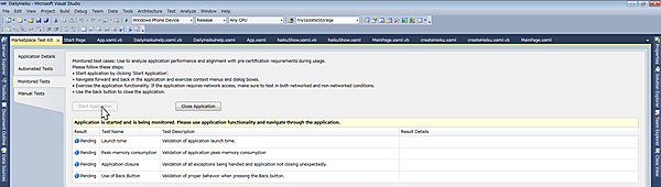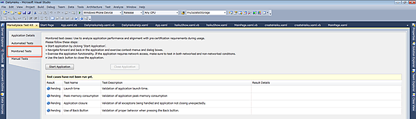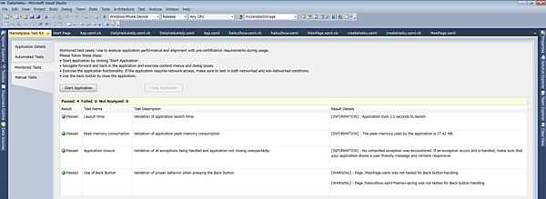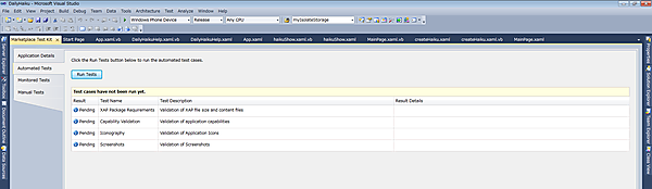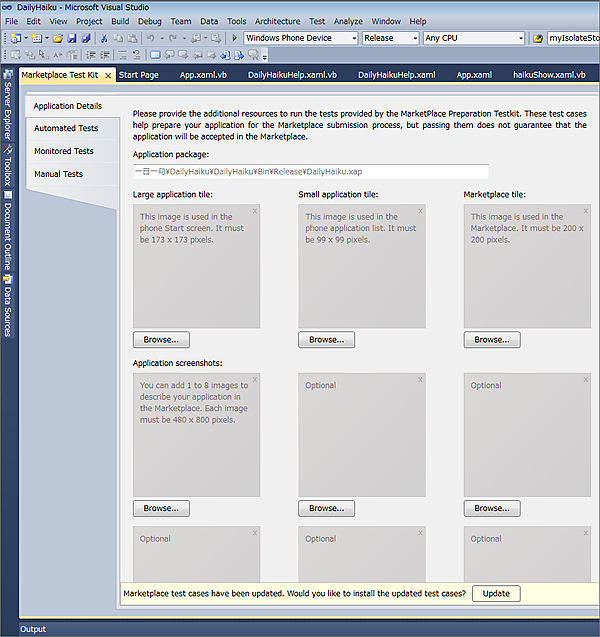 | (左上より)図16:Marketplace Testkitを開く/図17:「アプリケーションの詳細」画面/図18:3種類のタイルを追加する/図19:3種類のタイルを追加した (それぞれクリックで拡大) |