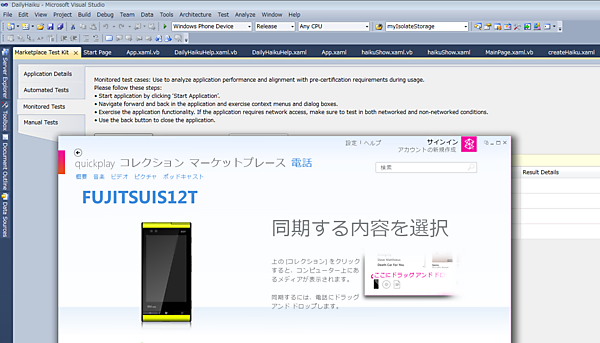 ここで、実機を接続してください。スイッチをONにすると、zuneが自動的に起動します(図26)。「アプリケーションを起動」をクリックし、アプリが起動したところで、一通りの操作を実行します(図27)。