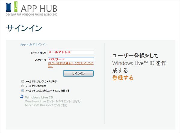 「規約と手続き」中の「Windows Phone 7 アプリケーションの提出手順説明」を一読した後、Windows Live ID アカウントでサインインします(図30)。