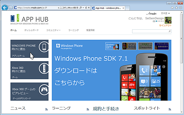 | 図33:2度目の申請からは、サインイン後、「WINDOWS PHONE向けに提出 アプリとゲーム」クリックで、直接申請画面に移動できる(クリックで拡大) |