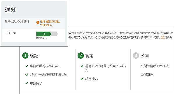 このページの「10. アプリのステータス」には、「認定済み」の後に「署名および暗号化が完了しました」がありますが、前掲の図53から分かるように、「通知」欄では、「認定済み」となっていても、前掲の図51の「認定済み」の横にチェックが付いていない限り、「認定失敗」に変わる可能性があります。