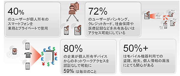 | 図2:企業におけるモバイル機器利用実態とセキュリティ・リスク(クリックで拡大) (Source:KRC Research and Juniper Mobile Threat Center) |