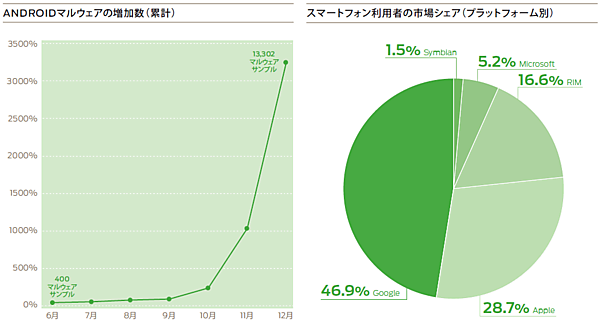 | 図3:Androidマルウェアの増加数とスマートフォン市場シェア(2011年自社調べ)(クリックで拡大) |