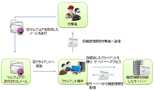 標的型メールと呼ばれるメールにマルウェアが添付されており、クライアントに感染させる事で、クライアントを操作し、機密情報が格納されているサーバーへアクセスさせ、機密情報の奪取や、アップロードを行うという流れだ。