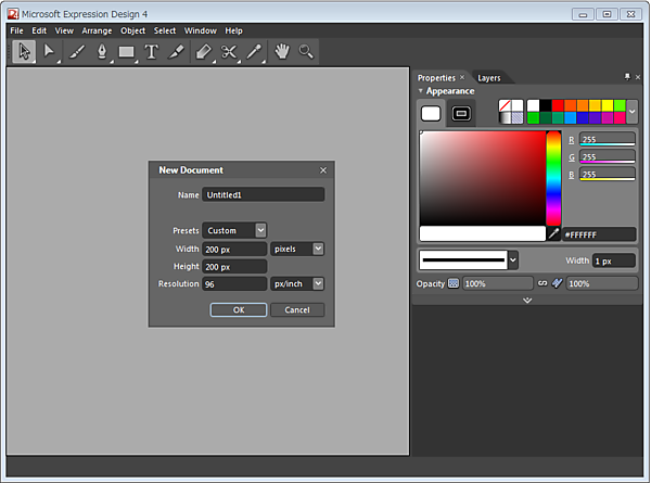Expression Designを起動し、「ファイル/新規」で、新規ドキュメントを作成します。その際、幅と高さには最も大きいマーケットプレイス タイルのサイズである200×200pixelを指定します。また、解像度が96px/inchになっていることを確認してください(図2)。