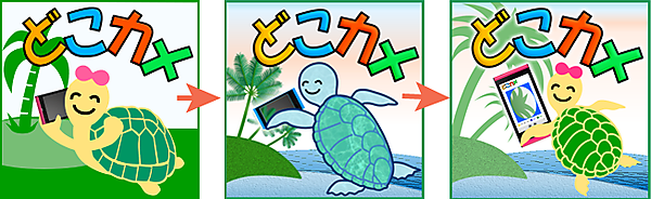 | 図19:左:ラフデザイン、中:アオウミガメを描いた途中経過、右:採用したタイル |