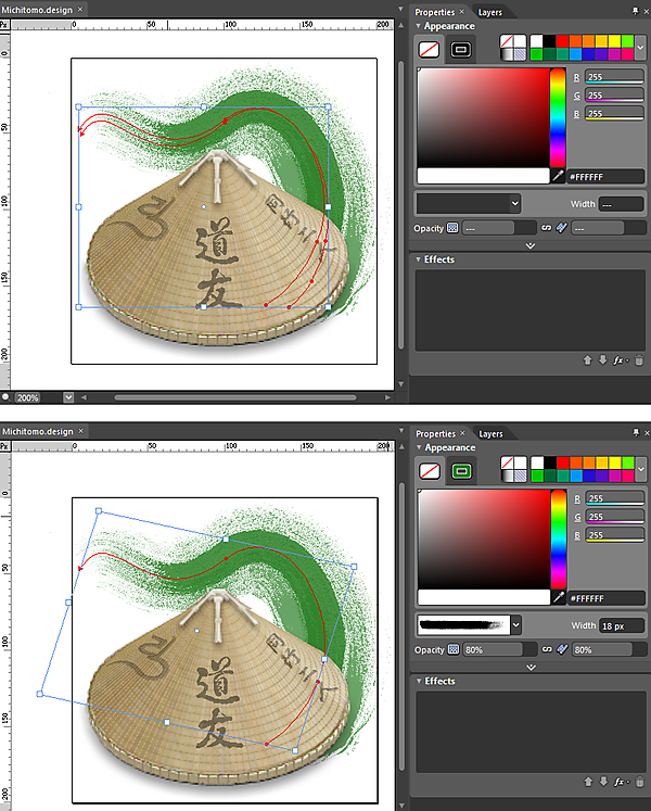 この2つには、菅笠と富士山の角度が同じ、毛筆タッチの線がほぼ同じ、という共通点があります。このように、シリーズものでは、共通のイメージを持つ部品を使うと良いでしょう。
