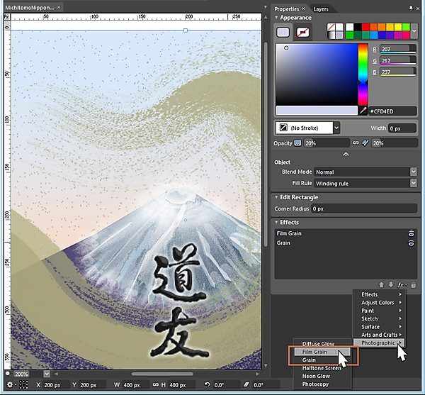 また、図21右の「道友日本」では、琳派(日本の造形芸術上の流派)に見られる色を使い、背景には色紙にあるような金箔(きんぱく)を散らしています。これはExpression Designのエフェクトで実現できます(図23)。