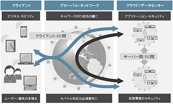 一方、「クラウド」環境を見ると、ひと昔前のようなクライアント‐サーバー型のアプリケーションからSOA型になり、サーバー間でのデータ・トラフィックの多いWebベースのアプリケーション・アーキテクチャに変わってきています。つまり従来以上にサーバー間でのセキュアなデータのやり取りを考慮する必要が出てきたということです。さらにそのサーバーは仮想化が進んでいますね。単にサーバー間のセキュリティというのではなく、物理サーバーと仮想サーバーの混在を前提としたサーバー間セキュリティを意識する必要があるわけです。さらにさらに、「クラウド」は進化を続けており、企業内のデータセンターや従来のデータセンターと分離独立しているだけでなく、“ハイブリッド・クラウド”や“バーチャル・プライベート・クラウド”など複数のデータセンターを跨(またが)るケースやクラウド自体が仮想化されるケースも見受けられます。