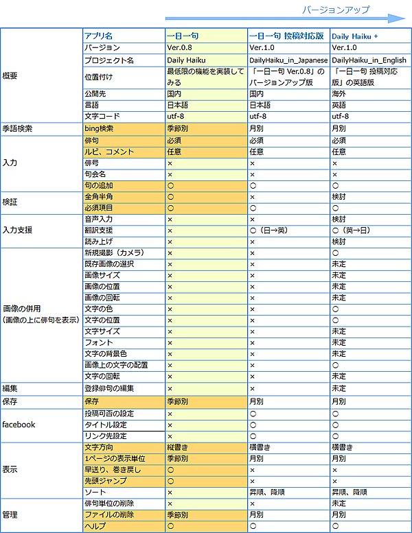 表2:実装する機能の候補をリストアップして、バージョン毎に絞り込む(○は実装予定、×は実装予定なし)