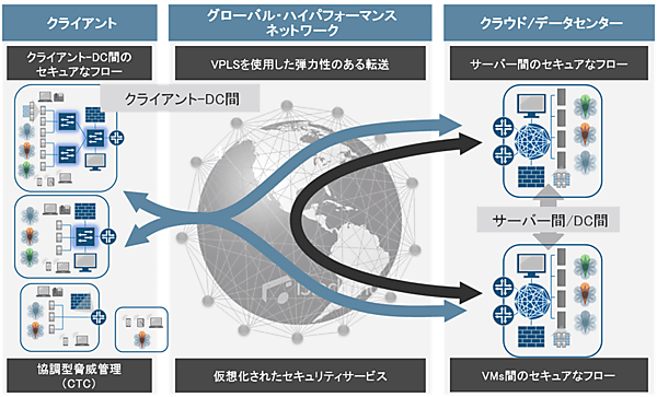 まずは「クラウド」のインフラ、データセンターです。多数の仮想サーバーがありますので、サーバー間のトラフィックのセキュリティを考慮する際には、仮想サーバーに特化したツールの検討が「クラウド対応セキュリティ」には必要でしょう。仮想サーバーの利便性を損なわないセキュリティです。複数のデータセンターをまたがる「クラウド」の場合には、データセンター間通信のセキュリティを考慮します。その場合には、VPLSなども有効な技術の1つです。これは仮想サーバーのデータセンター間の移動など、事業継続性確保やディザスタリカバリ用途としても有用でしょう。
