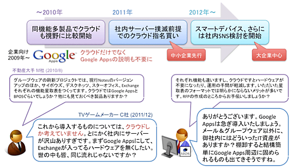 変化は、その企業の規模や業種業態もしくは所在地域などの違いで、程度の違いはあろうともほぼ間違いなく感じられる。なによりそもそものクラウド概念の説明が不要になってきた。いや、クラウドだけでなくGoogle Appsの基本的な説明すらも不要な場合がある。2年前から毎月登壇している自社主催セールスセミナーでも、当初は「クラウドは既に企業の利用に耐えるレベルですよ」とか「Appsは人数毎の従量課金でお求めやすいです」、果ては「Google AppsはSAS70認証が取得されていて公開企業でも大丈夫」などと説明していた。しかし最近では既にクラウドのメリットとリスクを十分に理解しているか、もしくは切羽詰まった状況で細かなことは考慮の外に追いやってGoogle Appsを指名買いしにくる方々ばかりとなっている。それも規模の小さな企業から始まって既に大企業も同じ考え方が浸透してきているように思われる。