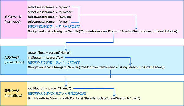 メインページで選択した季節の値は、入力ページに渡して季語検索と保存処理に利用し、さらに表示ページに渡して、表示するために読み込むXML文書の特定に用います。