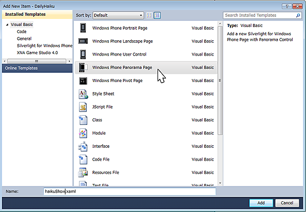 このページの処理のポイントは、スクリーンの右から左へと表示する簡易縦書き表示です。コンテンツが一画面を超える場合の左右フリックによる表示を実現するために、Panoramaコントロールを使います。ソリューションエクスプローラーのプロジェクト名を右クリックして表示される「追加/新しい項目」でPanorama Pageを追加してください。名前は、haikuShow.xamlとします(図16)。