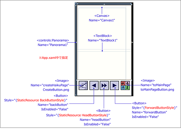 ページ送り用のButtonを3個配置し、名前を付けます。「forwardButton」は1つ前の句を表示し、「backButton」は次の句を表示し、「headButton」は1句目を表示します。これらのボタンには画像を貼り、先の入力ページの「一覧」ボタン同様、App.xamlの中にスタイルを追加します。