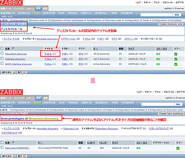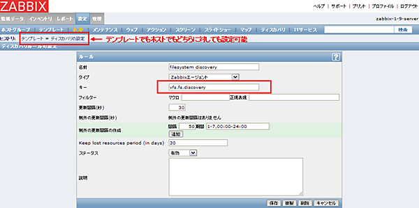 Zabbix Agentが稼働している監視対象機器については、ファイルシステム、ネットワークインタフェースの検出を行うことができます。