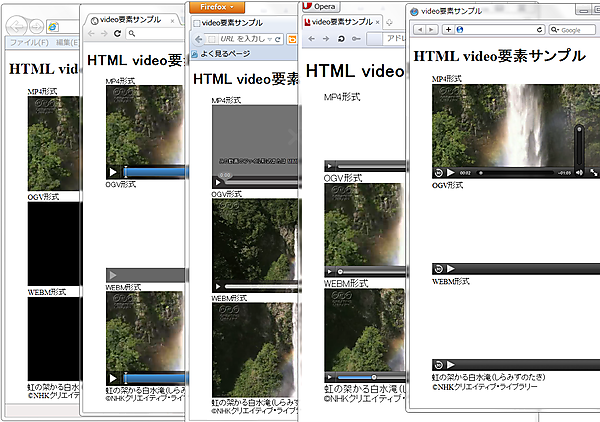 動画/音声ファイルの形式は、ブラウザによって対応状況が異なりますので、注意が必要です。実際に、以下のサンプルをWindows 7環境のIE、Chrome、Firefox、Opera、Safariの最新版で動かしてみました。