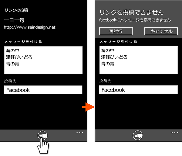 Windows Phone を持つすべての俳人が、facebookの友人に作品を伝えたいかどうかは分かりません。オフラインで応募作品を練りたい場合もあるでしょう。にもかかわらず、俳句を詠む度にfacebookへの投稿画面が表示されるのでは、ユーザーはうっとうしいと感じるはずです。