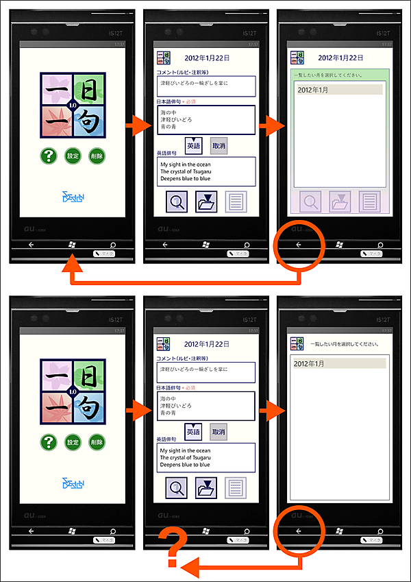 月選択画面は、入力用のCreateHaikuページ上にありますので、選択月が表示されている状態で実機の「戻る」ボタンを押した時は、その前のメインページに戻ります。このことは、本稿をここまで詠んできた皆さまには自明のことでしょう。しかしながら、ページ構成や処理を知らない(本連載読者ではない)ユーザーはそのように考えるでしょうか?