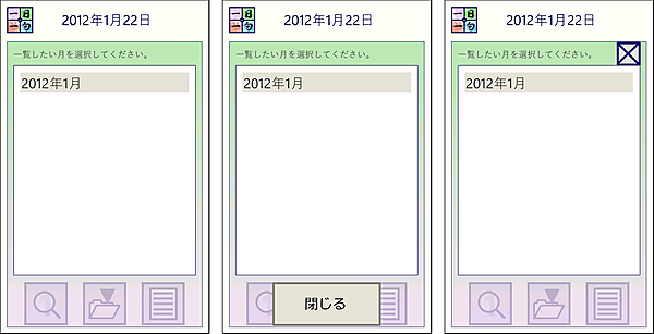 | 図18:考えられる月選択ウィンドウの閉じ方。左:このアプリでは月以外をタップすると閉じる。中:ボタンを付ける方法、右:「×」アイコンを使う方法(クリックで拡大) |