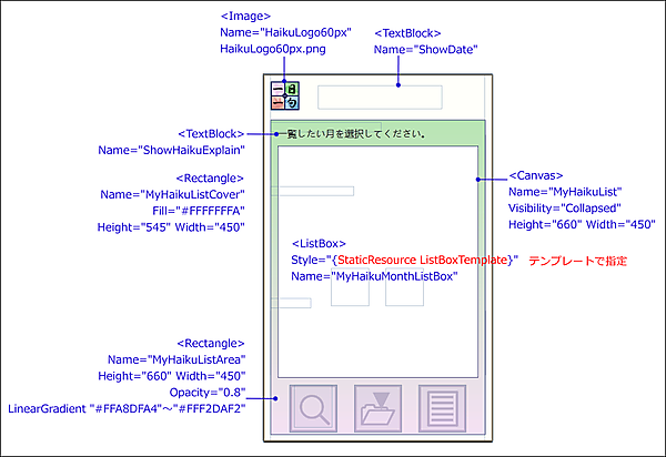 このファイル・リストは、俳句ファイルが存在している場合に有効になる「一覧」ボタンをタップして表示されるものです。そこで、Canvasコントロールを1個レイアウトし、Visibility="Collapsed"を指定して非表示状態にしておき、「一覧」ボタンがタップされた時に、プログラム中でWindows.Visibility.Visibleを指定して表示状態に切り替えます。