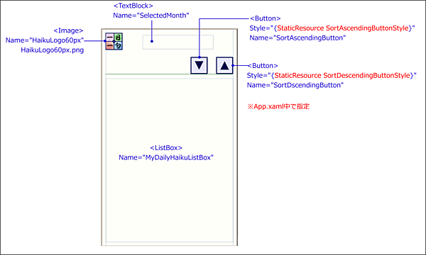 このページでレイアウトしたButtonコントロールのスタイル設定については、リスト4 のコードをApp.xaml内の