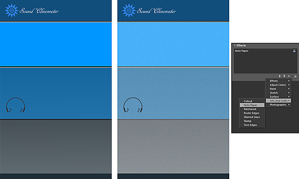 | 図8:ノートのテクスチャを全面にかぶせる。左:テクスチャがない場合/中:テクスチャをかぶせた場合/右:Expression Designでのノートのエフェクト設定(クリックで拡大) |