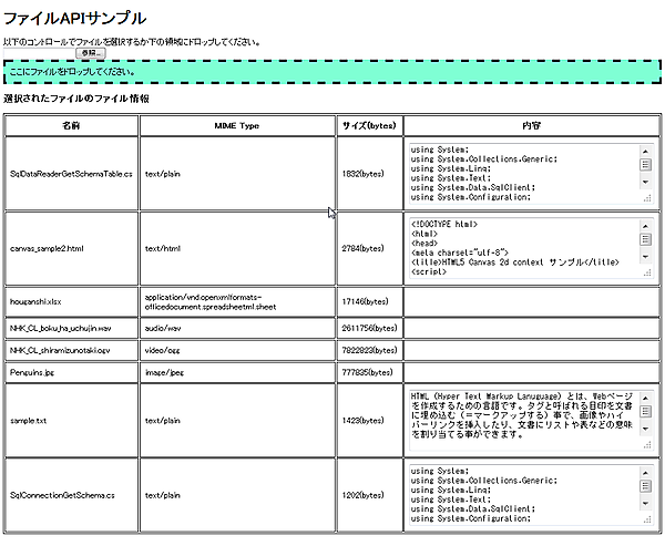 FileReaderオブジェクトを利用する事で、Fileオブジェクト(ファイル)の中身を読み込む事もできます。先ほどのサンプルの一部だけ修正して、ファイル情報表示のテーブルにテキストファイルの内容を表示します。