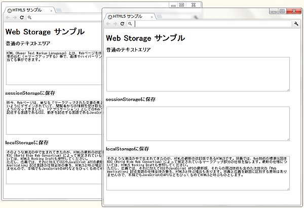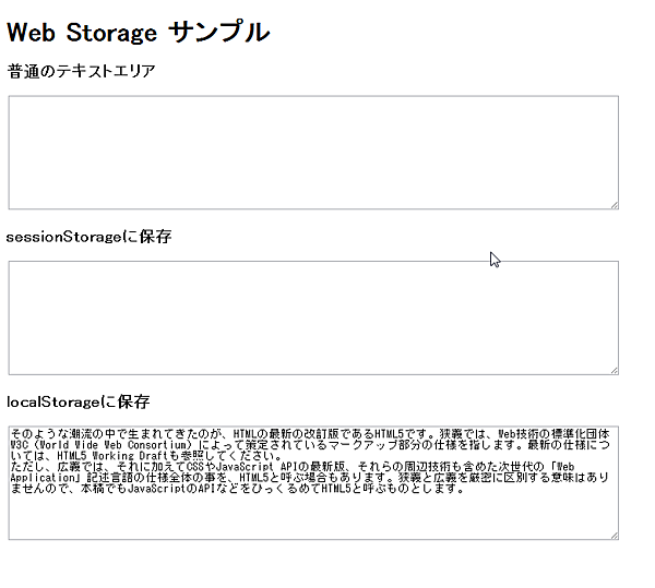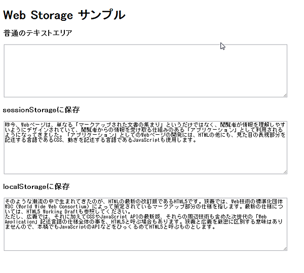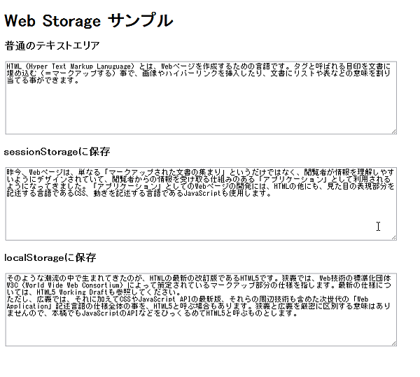 それでは早速、具体的な例を見てみましょう。以下は、テキストエリアに入力されたデータを保存しない場合と、sessionStorageとlocalStorageにそれぞれデータを保存する場合とを比較するサンプルです。上から2番目のテキストエリアにはsessionStorageを、3番目のテキストエリアにはlocalStorageを対応させてデータの保存を行います。