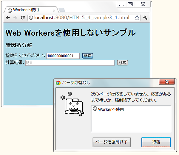 Workerを使用しないサンプルではブラウザの応答が止まってしまい、ウィンドウにアクセスしようとすると強制終了するかを問うダイアログが表示されます。