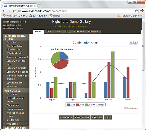 | 図10:Highchartsを使った折れ線・棒・パイチャートの組み合わせグラフ(クリックで拡大) |