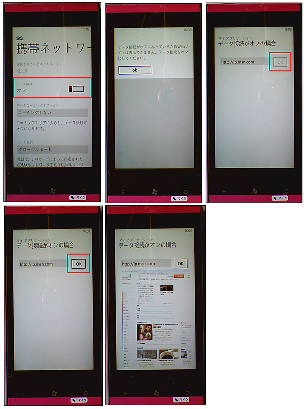 - 再び「データ接続」をオンに、または「フライトモード」をオフにすると、[OK]ボタンの使用を可とし、タップするとMSNのWebページが表示されます(図1)。