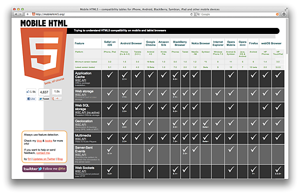 | 図3:「mobilehtml5.org」には各スマートフォンOS向けWebブラウザにおけるHTML5対応状況が詳しくまとめられている。iOS、Android OSだけでなく、Kindle FireやBlackBerryなど幅広く網羅 |