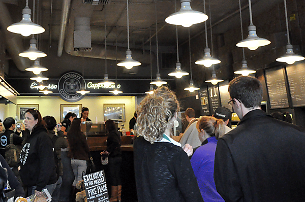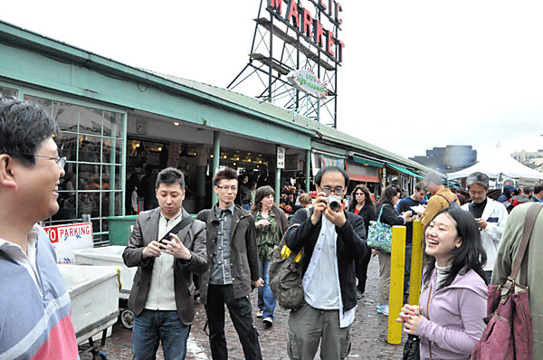 | | 左:到着したばかりの面々。このあとの予定をミーティング中 右:スタバ1号店のあるパイクプレイスマーケットに到着 |