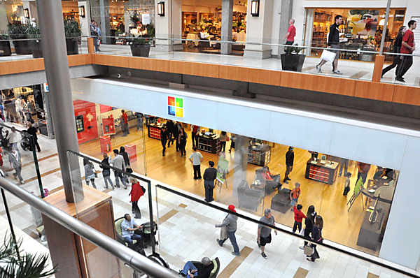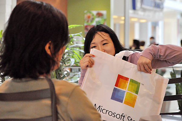 | | 左:ベルビューにてマイクロソフト・ストアを発見 右:「買っちゃったよ~」「袋だけでしょ、それ。」 |