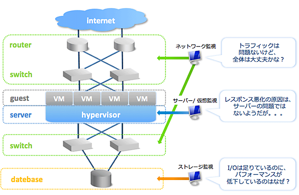 運用管理者側も“サーバー管理者”、“ネットワーク管理者”、“ストレージ管理者”と分かれている場合にはあまり明確に意識されないかもしれないが、システム全体としてのサービスレベルを保証しようとした場合、こうした“サイロ化”は全体を俯瞰(ふかん)することを難しくしてしまい、ともすれば不毛な“犯人捜し”に陥ってしまう可能性すらある。