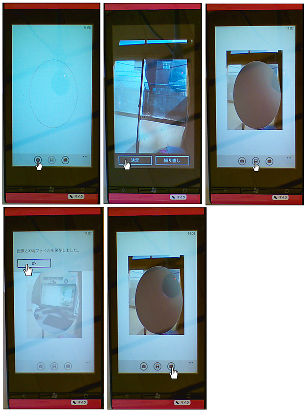 図1:CameraCaptureTaskを起動して写真を撮り、撮った写真を下絵にPhotoCameraが起動して写真を撮る(クリックで拡大) |