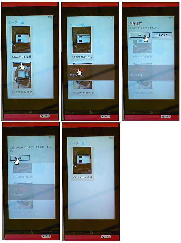 図2:「フォルダ」アイコンのタップで写した画像の一覧が表示される。任意の画像をタップするとコンテキストメニューが表示される。メニュー内の「データの削除」をタップすると、任意の画像が削除される(クリックで拡大) |