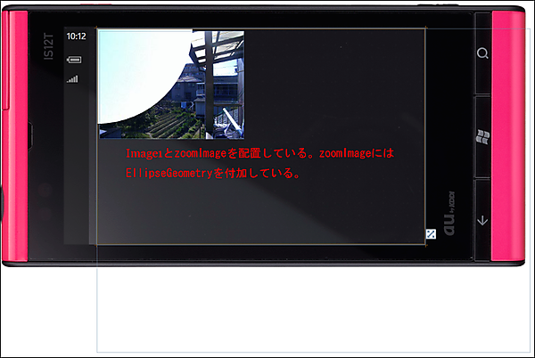 | 図3:Imageコントロールを3個配置し、前面のzoomImageにはEllipseGeometry を付加している(クリックで拡大) |
