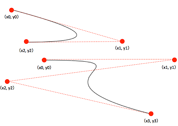 引数x1、y1...は、冒頭の図の座標に対応しています。また、x0、y0はquadraticCurveTo/bezierCurveToメソッドを呼び出す前の最後の座標を表すものとします(サンプルであればmoveToメソッドで指定された座標です)。