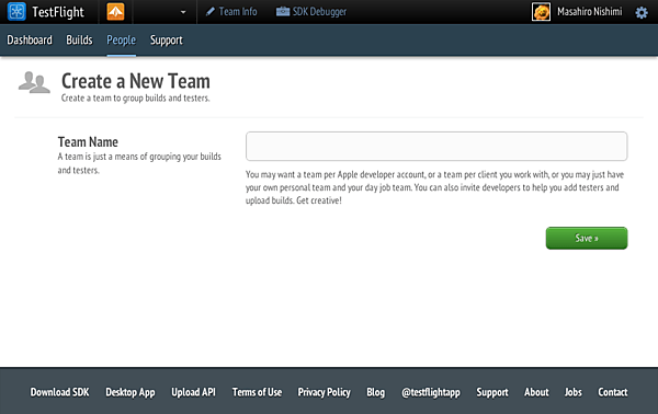 デバイスの登録が完了しましたので、次はテストチームを作成しましょう。PCからTestFlightにログインすると、未だチームを作成していないので新しいチームを作成する画面が表示されます。チーム名を入力して「Save」をクリックしましょう。