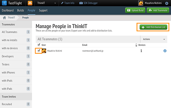 TestFlightでは「誰にアプリを配信するか」を管理するリスト、Distrubution Listを作成することができます。例えば、「開発チーム内のみに配布」「テストユーザーを含めた全ユーザーに配布」といった形で配布先を管理することができます。