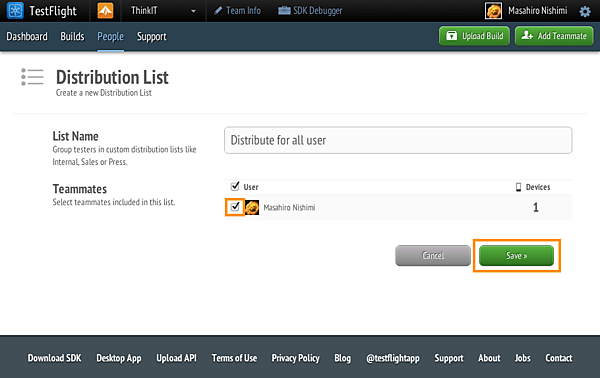 するとDistribution Listの作成画面が表示されますので、リスト名を入力し、「Save」ボタンをクリックします。この情報は後でアプリを配信する際に使用されます。